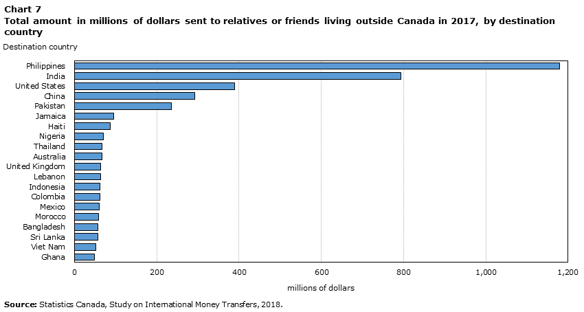 Let’s talk about our beloved Canada and India. As per Statistics Canada, in 2017 India received a whopping $794 million as remittances from Canada. The only country above India was the Philippines, which received $1.2 billion, God bless them. The fee paid by the remitter ranged from 2% for an amount above $1000, 11% if the amount is less than $200, and 6% otherwise.