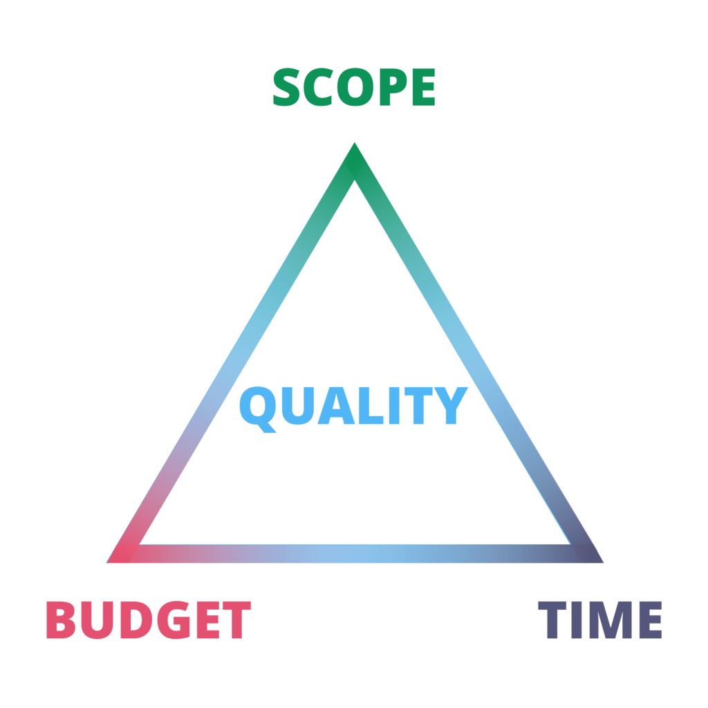 In Agile Project Management, there is a concept of the Iron Triangle. It has Time, Scope, and Budget as three opposing forces, and the combination of them determine the quality or value the customer derives from the project completion.
